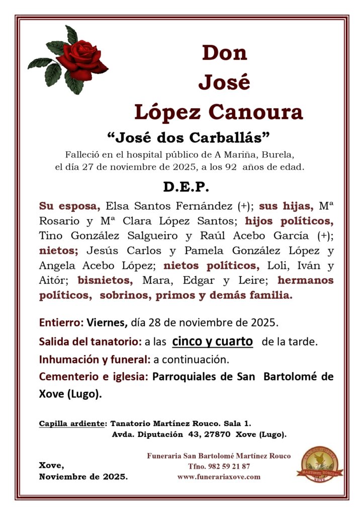 Los datos serán recogidos para gestionar la agenda de contacto para comunicaciones propias del negocio establecido, acciones promocionales por el responsable de los ficheros (ubicados en territorio de la unión europea) que es SAN BARTOLOMÉ-MARTÍNEZ-ROUCO SL (B27242189). Puedes consultar la información adicional y detallada sobre Protección de Datos en nuestra política de privacidad. Puedes consultar, rectificar o cancelar tus datos dirigiéndote al responsable del fichero mediante correo electrónico en la dirección info@funerariaxove.com.