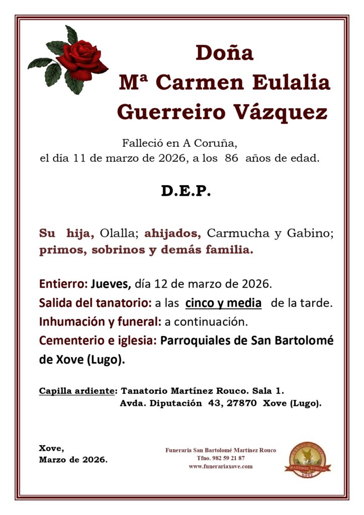 Los datos serán recogidos para gestionar la agenda de contacto para comunicaciones propias del negocio establecido, acciones promocionales por el responsable de los ficheros (ubicados en territorio de la unión europea) que es SAN BARTOLOMÉ-MARTÍNEZ-ROUCO SL (B27242189). Puedes consultar la información adicional y detallada sobre Protección de Datos en nuestra política de privacidad. Puedes consultar, rectificar o cancelar tus datos dirigiéndote al responsable del fichero mediante correo electrónico en la dirección info@funerariaxove.com.