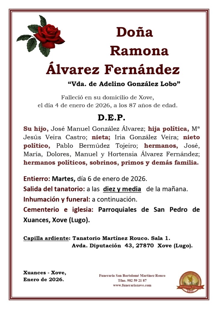 Los datos serán recogidos para gestionar la agenda de contacto para comunicaciones propias del negocio establecido, acciones promocionales por el responsable de los ficheros (ubicados en territorio de la unión europea) que es SAN BARTOLOMÉ-MARTÍNEZ-ROUCO SL (B27242189). Puedes consultar la información adicional y detallada sobre Protección de Datos en nuestra política de privacidad. Puedes consultar, rectificar o cancelar tus datos dirigiéndote al responsable del fichero mediante correo electrónico en la dirección info@funerariaxove.com.