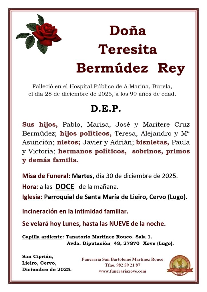 Los datos serán recogidos para gestionar la agenda de contacto para comunicaciones propias del negocio establecido, acciones promocionales por el responsable de los ficheros (ubicados en territorio de la unión europea) que es SAN BARTOLOMÉ-MARTÍNEZ-ROUCO SL (B27242189). Puedes consultar la información adicional y detallada sobre Protección de Datos en nuestra política de privacidad. Puedes consultar, rectificar o cancelar tus datos dirigiéndote al responsable del fichero mediante correo electrónico en la dirección info@funerariaxove.com.